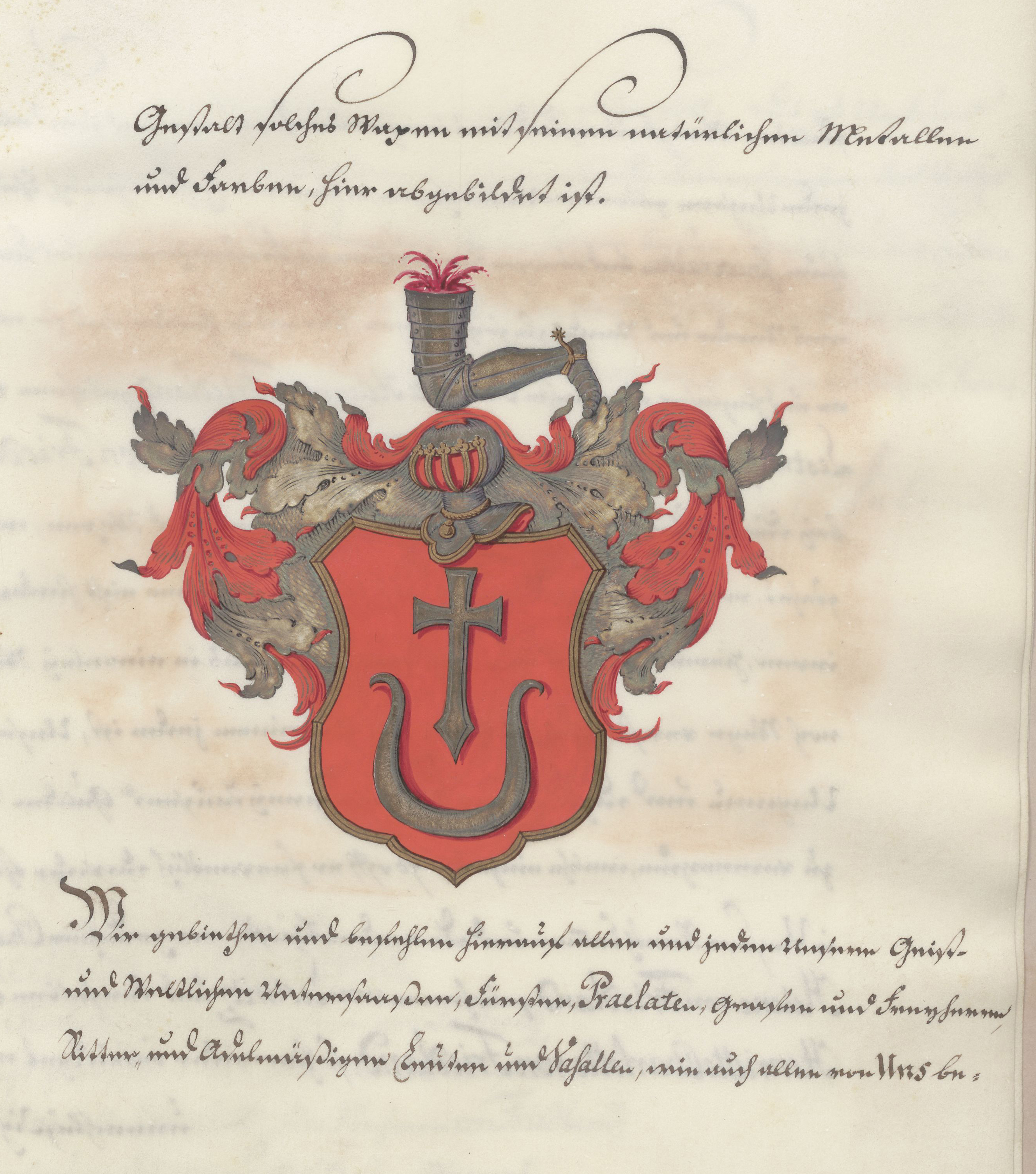 Die Helmdecken sind zu beyden Seiten roth und silbern. [Die fünfte Seite ist leer.] [sechste Seite] Gestalt solches Wapen mit seinen natürlichen Metallen und Farben, hier abgebildet ist.