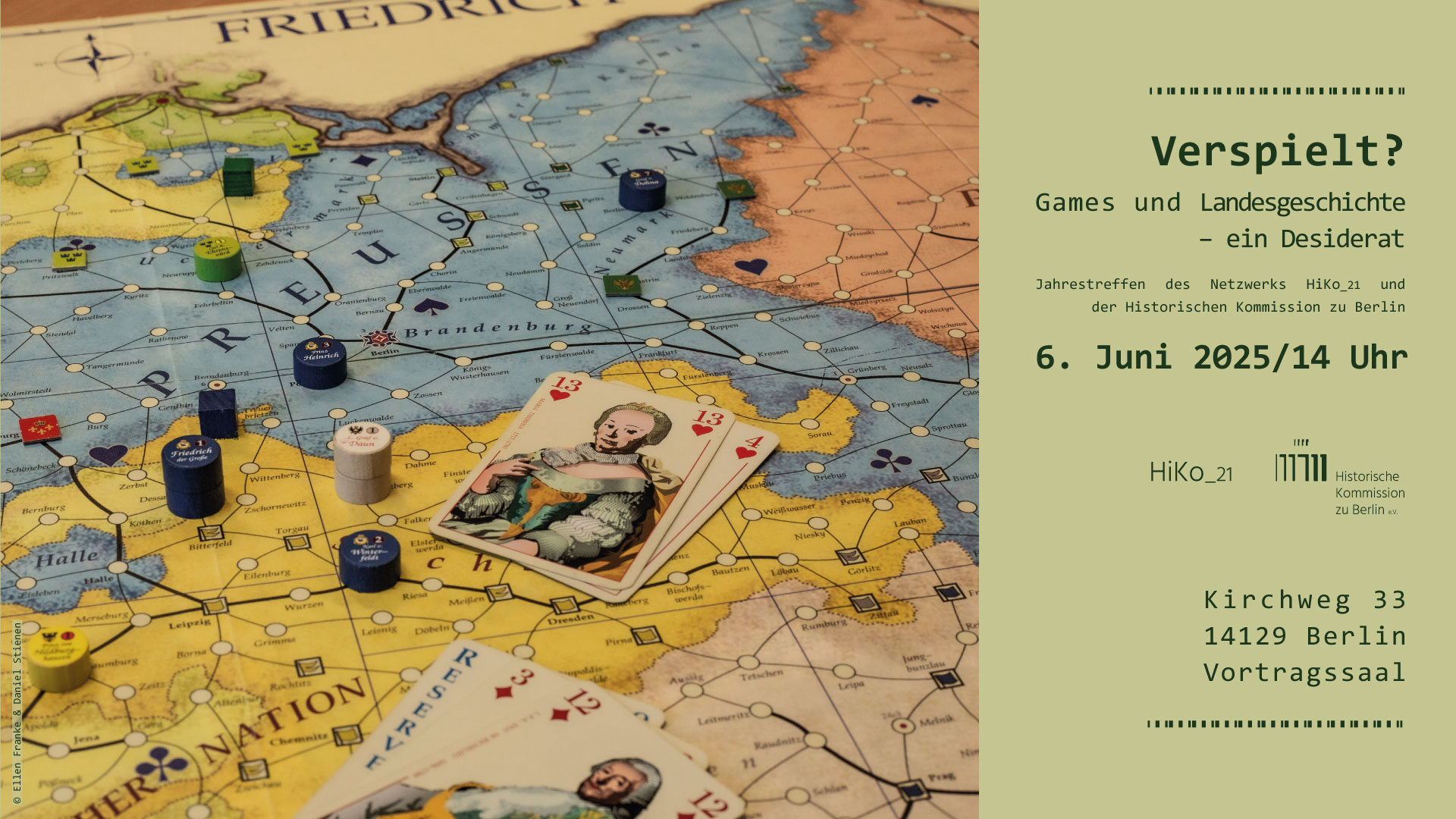 Ziel der Veranstaltung ist es, digitale und analoge Spiele mit Preußen- und Berlinbezug mit den Instrumentarien der historischen Spieleforschung einzuordnen und den Praxisbezug zwischen Spieleentwicklung und Geschichtswissenschaft herzustellen. Hierfür konnten wir renommierte, historisch arbeitende Spieleforscher*innen gewinnen. In einem Ausblickreferat werden zudem Möglichkeiten und Grenzen einer Verknüpfung von Game Studies und Landesgeschichte ausgelotet.